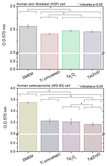 To further study the potential biocompatibility of the uncoated Ti, Ta2O5, and Ta(Zn)O films, HSF and MG-63 cells were individually and directly cultured onto each kind of specimen for 48 h followed by MTT assay (Figure 8).