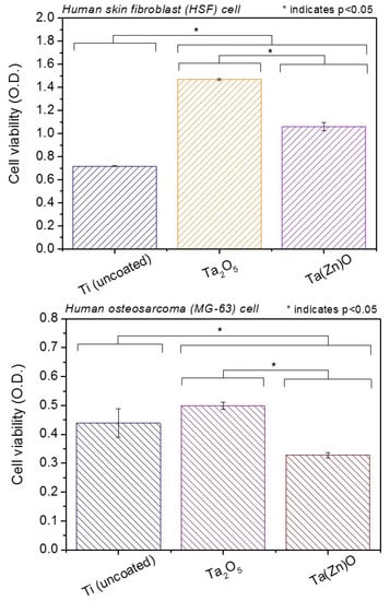 - The results of the ISO-10993-5 cell cytotoxicity and cell viability MTT assay tests revealed that the Ta2O5 or Ta(Zn)O coated Ti had better cell viability and lower cytotoxicity in HSF cells, and both coatings possessed high biocompatibilities in this study. The cell activity of Ta(Zn)O coated Ti decreased slightly when reacting to the MG63 cells. The result showed that the Ta2O5 coating on Ti surface with porous structure improved adhesion, migration, and proliferation for the osteoblastic cell. Due to the different properties of cells, HSF and MG-63 cells represented different behaviors of cell cytoxicity and cell viability in each kind of coating specimens on Ti.
