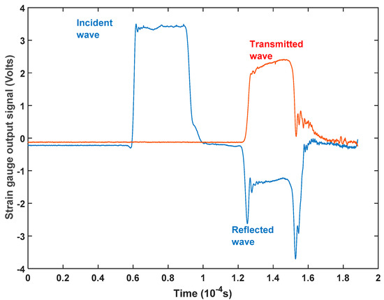 It is clear that the time at which the waves start picking up in magnitude is not the same for the transmitted and the reflected wave. The estimated picking up times in Figure 2 for the reflected and the transmitted wave are 0.0001214 s and 0.0001229 s, respectively. The reason for this difference in time between these two waves is that the incident wave is immediately reflected at the incident bar/specimen interface, while the transmitted wave occurs upon the wave travelling through the specimen. The reflected signal (t) was captured from the strain wave of the incident bar, whereas the transmitted strain signal (t) was captured from the strain wave of the transmitter bar for the same time range as the reflected strain wave. These signals were converted into strain using Equation (1), before input into an existing MatLab programme that converts such signal in stress , strain and strain rate using Equations (2)–(4):