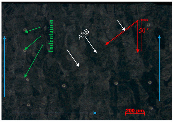 Illustration of typical indentations made on the cut surfaces of the specimens. The blue and red arrows show the direction of indentation and inclination of adiabatic shear bands (ASB), respectively.