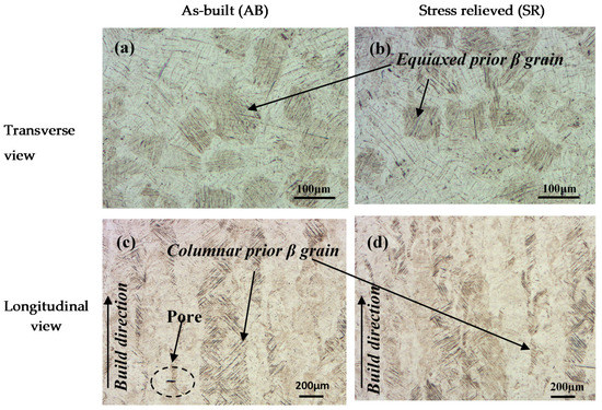 Typical optical micrographs of the as-built (AB) (a,c) and stress-relieved (SR) (b,d) transverse and longitudinal sections of the specimens in relation to the build direction, respectively.