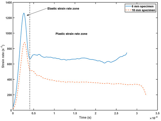 This figure shows that the length of the compression specimen has an effect on the strain rate for the same striker velocity, which further confirms Equation (4) in Section 2.2. From the figure, it is seen that the strain rate varied significantly with time, particularly during elastic deformation of the specimens, and remained relatively constant during plastic deformation. The 6 mm and 10 mm specimen for the two forms of alloy yielded average plastic strain rates of approximately 700 s−1 and 400 s−1, respectively, for the same applied impact velocity of approximately 11 m/s.