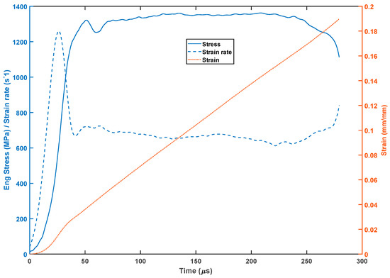 Typical stress, strain rate and the strain against time graph for a 6 mm long SR Direct Metal Laser-Sintered (DMLS) Ti6Al4V specimen.