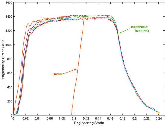 The curves shown in Figure 7 also exhibit the three regions of elastic and plastic deformation discussed above. After dissipation of the effect of the applied impact, the stresses induced in the specimens dropped. Most reported cases of fracture occurred in this region, after which the stress dropped to zero, as shown in Figure 7.