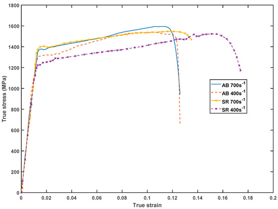The high strain rate average compression stress–strain curves for the AB and SR samples, such as the set of curves shown in Figure 7, are presented in Figure 8.