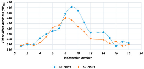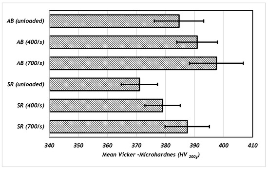 The obtained values of the Vickers microhardness test for the unloaded samples and the two sets of specimens (AB and SR) that were exposed to compressive high strain rate testing at the average plastic strain rates of 400 s−1 and 700 s−1 showed variations over the range of indentations done. The average values (bars) and standard deviation (error bars) of Vickers microhardness for the unloaded and loaded AB and SR samples are presented in Figure 9.