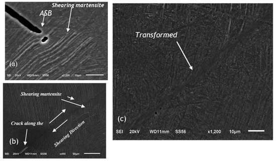 In a secondary electron image (SEI) mode of a SEM, deformed and transformed ASBs zones were observed on the longitudinal surfaces of the two forms of specimen that did not fracture. The micrographs, for the specimens that were deformed under either one of the two strain rate regimes of 400 s−1 and 700 s−1 are shown in Figure 12 and Figure 13. The deformed ASBs are considered as zones of intense concentration of shear strain with no definite boundaries, whereas dynamic recrystallisation or phase transformation does occur in transformed ASBs, and they also have clear boundaries [31]. In Figure 12a, the martensitic structures are seen to be under shear strain, with no definite boundaries observed between the matrix and ASBs. Shear zones, as well as the transformed ASBs, with definite boundaries forming at the centre of the deformed zones, are observable in Figure 12b. Figure 12c shows the transformed ASB under high magnification. The narrow zones pointed to as transformed ASBs are known to be areas of dynamic recrystallisation [18].