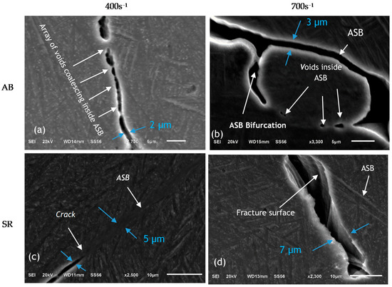 In Figure 13, voids and cracks are apparent, with clear signs of coalescence within the formed ASBs. It is evident from the micrographs in Figure 13 that the locations of ASBs can be considered as sites for further damage and future failure when the voids and cracks coalesce along them. Figure 13a,b shows a typical array of coalesced voids in well-developed ASBs. Initially, the voids can typically be considered spherical or elliptical, as shown in Figure 13b. However, upon their growth, and therefore their diameters reaching the thickness of the shear bands, the voids merged, and extended along the shear bands, forming into elongated cavities. The width of these resulting cavities may therefore be considered to be the same as the width of the transformed shear band. The widths of these transformed shear bands are seen to be narrower in the case of AB specimens (Figure 13a,c) in comparison to those of SR specimens (Figure 13b,d) at the same test strain rate. The measured average width along the transformed shear bands for the AB and SR specimens at the strain rate of approximately 400 s−1, are seen in the figure to be 2 μm and 5 μm, respectively. Those at a strain rate of approximately 700 s−1 are slightly higher, at 3 μm and 7 μm for AB and SR specimens, respectively.
