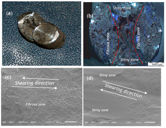 Typical photograph (a), optical micrograph (b) and secondary electron images (c,d) of the fracture surfaces of DMLS Ti6Al4V (ELI), showing fibrous and shiny zones.