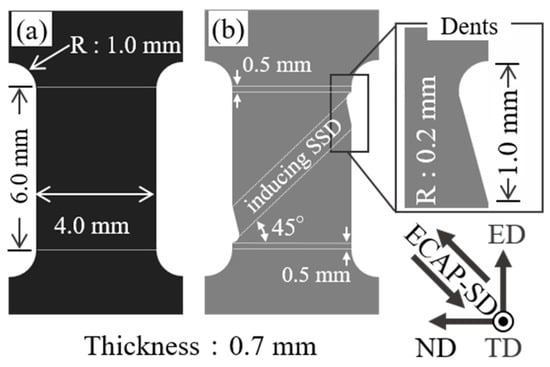 Schematics of the specimen shapes. The coordinate axes of ECAP (TD: transverse direction, ND: normal direction, ED: extrusion direction, ECAP-SD: shear direction of final ECAP) are also shown. (a) The undented specimen. (b) The dented specimen, which had semi-teardrop-shaped dents on both sides. An enlarged view of the dent is also shown. The two dents were intended to produce simple shear deformation (SSD) in the region shown by the white dashed lines.