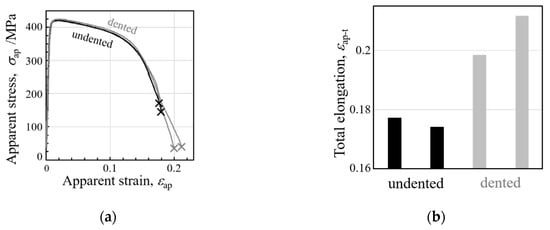 (a) Tensile results of the undented and dented specimens showing the relationship between the apparent stress εap and strain εap. The “X” marks are the fracture points of each specimen. (b) Total elongation εap-t of the undented and dented specimens.