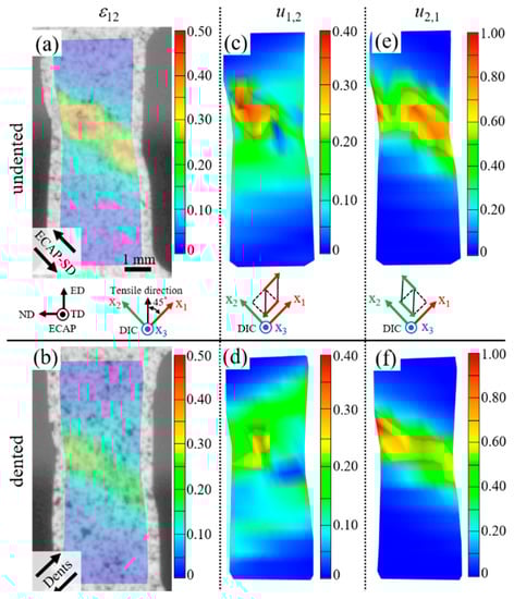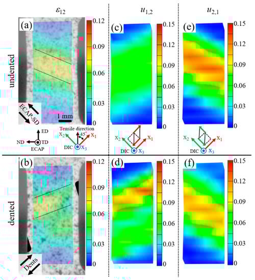 During the late stage of local deformation (εap = 0.155) for the undented specimen, as shown in Figure 4a, large shear deformation was caused along ECAP-SD as well as that during the initial stage of local deformation. Figure 4e also shows that large simple shear deformation was caused along ECAP-SD. The large u1,2 in the regions shown in Figure 4c seems to have resulted from chuck binding. For the dented specimen as shown in Figure 4b, unlike that during the initial stage of local deformation as shown in Figure 3b, shear deformation developed along ECAP-SD in narrow regions. These show that the shear band was localized along ECAP-SD regardless of the specimen’s shape during the late stage of local deformation. However, the shear strain of the dented specimen was smaller than undented specimen. As for u1,2 and u2,1, Figure 4d,f show that u2,1 was larger than u1,2 and concentrated in narrow regions.