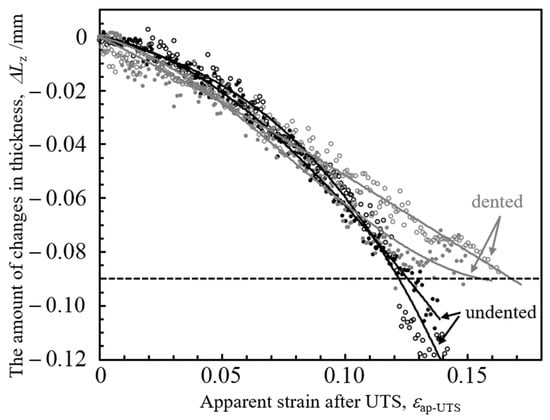 Changes in thickness of the dented and undented specimens. The broken line shows ∆LZ = −0.09 mm.