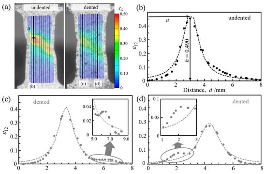 where h is the peak value of ε12, w is the full width at half-maximum, and u is the peak position. As shown in Figure 6b, the Lorentz function fits well to the value of ε12 in all positions of the undented specimen. However, this function does not fit well to some results of the dented specimen due to the presence of two peak points as shown by the insets in Figure 6c,d.