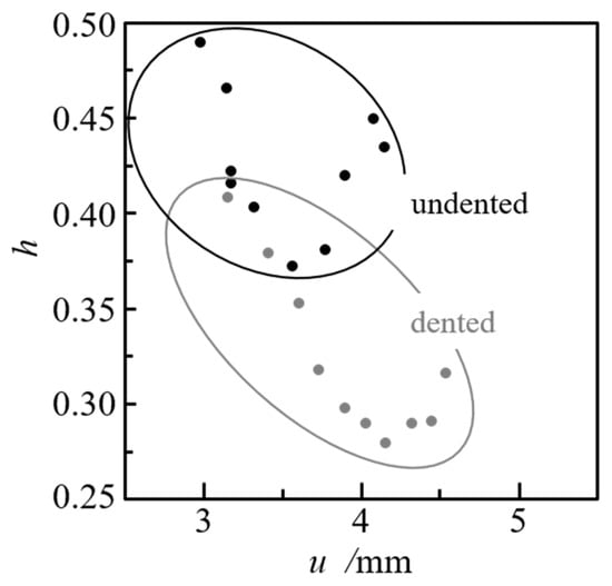 Figure 7 shows the relationship between the two fitting parameters, u and h, which indicates the location of the most concentrated shear strain and the peak value of ε12, respectively. As shown in Figure 7, h values of the undented specimen are generally larger than those of the dented specimen. This result indicates that undented specimens easily cause large shear strain due to the occurrence of simple shear deformation in only one direction (u2,1), while the dented specimens could restrain the occurrence of large shear strain by pure shear deformation.