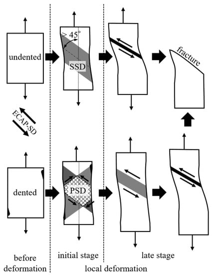 On the basis of the experimental results obtained in the present study, we show the schematics of the local deformation for the undented and dented specimens in Figure 8. For the undented specimens, shear bands develop along ECAP-SD by simple shear deformation during the initial stage of local deformation. The dominant simple-shear deformation in the initial stage cause shear band localization early. Furthermore, the occurrence of many micro-shear bands in narrow regions due to the shear strain concentration causes a rapid decrease in plate thickness and eventually leads to fracture []. On the other hand, for the dented specimens, the shear bands developed from each of the two dents during the initial stage of local deformation. That is, the dented specimens have pure-shear-deformation zone owing to simple shear deformation in the two directions as shown in Figure 8. This extensive pure shear deformation enables to delay shear band localization. As a result of this, the delay of shear stress concentration [,] may cause a gradual decrease in plate thickness in the late stage owing to the suppression of the occurrence of micro-shear bands causing thickness reduction [,] in narrow regions, and the dented specimens are thus able to increase total elongation compared to the undented specimens.