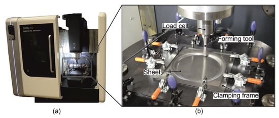 For the validation of the numerical process model truncated cone geometries are manufactured by single point incremental forming. The dimensions of the truncated cone geometry are shown in Figure 1a. A conventional 5-axis DMU 50 milling machine from DMG Mori (Bielefeld, Germany) was used for this step (Figure 2a). The truncated cones were made of aluminum alloy AA5083 with an initial sheet thickness of t0 = 1 mm. The production is carried out with a bidirectional tool path with a driven forming tool with a spherical end and a radius RTool = 7.5 mm (Figure 1b). The step-down increment is varied in three steps: Δz24 = 1.875 mm, Δz12 = 3.75 mm, and Δz8 = 5.625 mm. All other process parameters are kept constant according to Table 1. The sheet was fixed with a clamping frame (Figure 2b). A deep-drawing oil (Castrol Iloform PN 226) was applied to the sheet metal surface as lubrication.