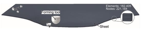 The numerical model of the process was built in ABAQUS/Explicit and consists of the forming tool as a rigid body and the elastic-plastic sheet metal built of solid elements (C3D8) with an edge length of 1 mm and five elements over the sheet thickness (Figure 3). An explicit time integration with a time step of 1 × 10−6 was used. The computations are done using the high performance cluster (HPC) LiDO3. The total CPU time spent was approximately 32 h.