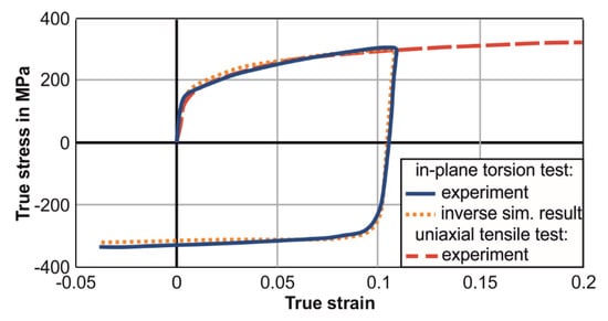 The material model for the sheet includes combined isotropic-kinematic hardening based on Chaboche. The AA5083 base material was characterized using the uniaxial tensile test and in-plane torsion test (Figure 4) according to Maaß et al. [14]. The material coefficients in Table 2 are determined inversely using the cyclic loading test results according to Chaboche’s procedure [15]. The initial flow stress of the material was determined to be σf,0 = 165 MPa. A penalty contact is used for forming tool and sheet. The friction coefficient between the well lubricated forming tool and the sheet was set to μ = 0.03 as revealed in strip-tension tests. The numerical simulation starts with a simulation of the incremental single point forming process with ABAQUS/Explicit including mass scaling (mass scaling factor 103). The explicit simulation to evaluate the forming mechanisms is followed by a subsequent implicit simulation of the unclamping to determine the residual stresses.