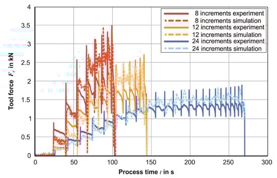 Experimentally and numerically determined process forces for 8 increments, 12 increments, and 24 increments of the same final geometry.