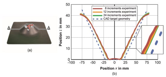 A comparison of the geometry (cut A-A) of experimental results is shown in Figure 6a. With a decreasing number of step-down increments, there is an increasing waviness of the inner surface due to the increase of the step-down increment amount (Figure 6b). The maximum geometric deviation from the CAD target geometry is 11% due to process-related springback effects. The deviation is defined as the maximum distance between two points on the profiles with the same x-coordinate. The highest deviation is measured in the flange area after unclamping. However, the accuracy of the final geometry increases with a decreasing number of step-down increments due to an increased springback as shown in Ambrogio et al. [16], the maximum deviation between the three final geometries is 4.8%. Therefore, it can be assumed that a variation of the step-down increment, within the examined limits, has no significant effect on the resulting geometry of the component.