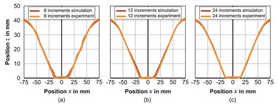 Comparison of numerical and experimental geometry (cut A-A): (a) 8 increments; (b) 12 increments; (c) 24 increments.