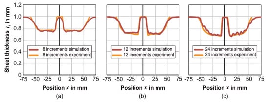 Comparison of numerical and experimental sheet thickness distribution (cut A-A): (a) 8 increments; (b) 12 increments; (c) 24 increments.