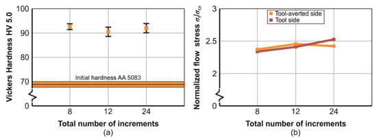 Regarding the number of increments, the strain-induced hardening is stationary with an increasing number of increments (Figure 9a). Figure 9b presents the normalized flow stress σf/σf,0 at the tool-side and the tool-averted side for a different number of increments. The normalized flow stress is increased with an increasing number of increments while the experimental hardness measurements are stationary (Figure 9a). The increase on the tool-averted side is higher than on the tool side for the amount of increments, but there is a turnover with an increasing number of increments.