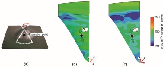 The residual stress prediction of the numerical model was already experimentally validated by residual stress measurements using X-ray diffraction in Maaß et al. [14]. In this publication residual stresses were measured on both sides of linear grooves in tool feed direction and perpendicular to the tool path direction in the same measuring point. The overall variation of the numerical results compared to the experimental results was determined as 7%. For the present study, the residual stress amplitudes are output on both sides of the sheet in the center of the formed component wall at a height of 22.5 mm (middle of the cone wall, Figure 1a). The stress distribution of σ22 residual stresses in the cone wall is almost rotationally symmetric (except for the tool step-down area) and follows the pattern shown as an example for a sliced area around the evaluation point in Figure 10.