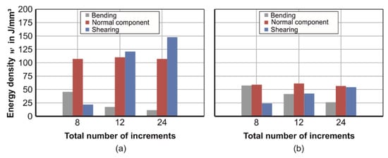 Simultaneously, the bending mechanism decreases continuously with an increasing number of increments, in an opposing trend. The normal component on the tool side varies within a small range, remaining almost constant with an increasing number of step-down increments. At the tool-averted side, the qualitative development of the forming mechanisms is equal to the tool side (Figure 12b). However, the forming mechanisms shearing and the normal components are at a lower level than on the tool side. The bending mechanism is slightly higher on the tool-averted side than on the tool side. Although the used element type may be prone to shear locking, this was not an obvious problem in the presented study as both the displacements or geometry and the forces were validated experimentally, meaning that a stiffness over prediction was not observed in the simulation results.