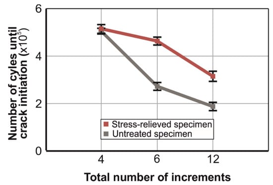 Regarding the effects of residual stresses on the mechanical properties, Maaß et al. [20] provide detailed information. Using a cyclic loading test setup of heat-treated and not heat-treated specimens, as explained in Maaß et al. [20], with an increasing number of increments, the relationship between residual stresses on the tool side and the failure of a component is shown (Figure 13). The failure can be clearly assigned to the residual stresses by comparing stressed specimens and stress-relieved specimens. A relationship between the tensile residual stresses on the tool side and a 42% reduction of the lifetime in cyclic load tests until a component failure is experimentally shown.