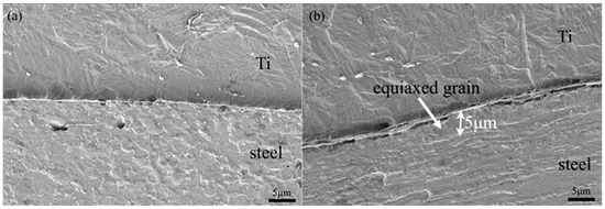 SEM micrographs of the detailed interfacial microstructure of the TA1/LAS composite plates are shown in Figure 4. It is evident that the equiaxed grains composing the vortex are about 2 μm as shown in Figure 4a. The microstructure of the TA1/LAS interface away from the vortex is shown in Figure 4b. The equiaxed grains also appear on the steel-rich side of the TA1/LAS interface, which is limited to a region of about 5 μm from the interface. Moreover, an elongated grain region was formed adjacent to the equiaxed grain region. These equiaxed grains were produced by dynamic recrystallization; therefore, the thickness of equiaxed grain regions in the wave crest region is larger than that of the wave trough region, due to the temperature in the wave crest region. These results reveal that the high friction of steel and Ti induces a large amount of plastic deformation in the matrix, which results in significantly refined/elongated grains in the steel plates.