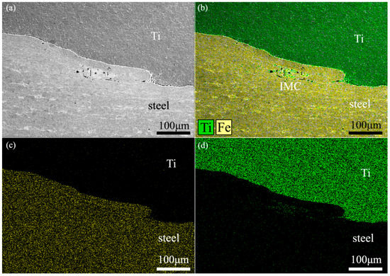 (a) Bonding interface in TA1/LAS composite plate and (b) EDX analysis maps showing the distribution of Fe and Ti. EDX-derived elemental maps for (c) Fe and (d) Ti.