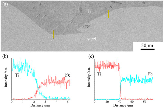 Elemental line scans of Fe and Ti using EDS were conducted to determine the distribution of elements across the bonding interface. Typical interface microstructure and compositional profiles of the Ti/steel interface without vortices in different regions are shown in Figure 6. It is evident that EDS did not show any traces of IMCs in the Ti/steel interface free of vortices. A thin diffusion layer appeared in the bonding interface. In the diffusion layer, the Ti concentration decreases from the TA1 side to the LAS side, while the Fe concentration gradient is the opposite. The high temperature and high pressure generated by the collision of the explosion welding are instantaneous (about 10−6 s) [13], so there is not enough time to form a thick diffusion layer and IMCs. The thickness of the diffusion layer is about 3 μm and 1 μm at the crest of the wave and the trough of the wave, respectively. The diffusion thickness in the wave trough region is much thinner than that at the crest of the wave. This is also caused by the crest of the wave due to the higher temperature during explosive welding.