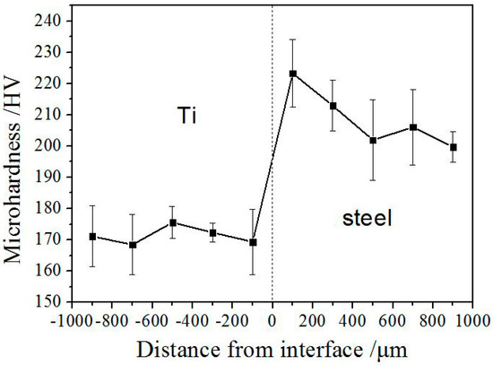 The Vickers hardness profile across the bonding interface of TA1/LAS after explosive welding is shown in Figure 7. It can be seen that the maximum hardness of LAS was obtained near the bonding interface, then hardness values of LAS decrease with the increase in the distance form bonding interface until the distance reaches 500 μm, and then the hardness remained nearly constant. These results suggest the LAS near the bonding interface has the highest hardness. This is due to: (i) the fine grain strengthening effect caused by the formation of fine grains and elongated grains near the bonding interface during the explosion welding process and (ii) dislocation strengthening due to high dislocation density near the bonding interface. On the other hand, in the TA1 matrix, the hardness apparently does not change with distance from the bonding interface.