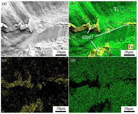 (a) Morphologies of the shear fractures of LAS/TA1 and (b) EDX analysis maps showing the distribution of Fe and Ti. EDX-derived elemental maps for (c) Fe and (d) Ti.