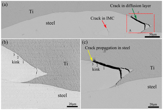 Bending tests were also used to analyze the effect of the bonding interface structure on the initiation and propagation of early microcracks. Figure 11a shows an SEM-BSE (Electron back scattered diffraction) picture of the interface after bending 30 degrees. It is evident that two kinds of microcrack appear in the BSE picture. One kind of microcrack occurred in the IMC region of the vortex as indicated by a red arrow. Another kind of microcrack occurred at the bonding interface of the crest of the wave as indicated by a green arrow, where there is a diffusion layer of about 3 μm. However, no microcracks appear at diffusion layers in wave trough regions, which suggests that the thinner diffusion layer could restrain the initiation of microcracks. The microcrack within the IMC region ended at the bonding interface between the IMC and the steel matrix. The result suggests that it is easy to generate microcracks in the IMC region, but microcrack propagation is hindered at the IMC/steel interface. As most IMC regions are enclosed by steel as shown in Figure 5, microcracks cannot propagate further. These results show that the IMC region is very susceptible to induce microcrack initiation; however, microcrack propagation will be hindered by the bonding interface, restraining further propagation and delamination. Figure 11b,c show the detailed micrograph of region A in Figure 11a before and after bending in order to analyze the process of microcrack propagation at the bonding interface. It is clear that there are some microcracks in the crest of the wave before bending as shown in Figure 11b, which are caused by the Ti/steel stress mismatch during the explosion welding process. Microcracks at the bonding interface are significantly propagated after bending as shown in Figure 11c, which suggests that the microcracks appearing at the diffusion interface are easier to propagate than microcracks in IMCs, and play a more important role in the delamination process.
