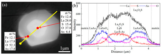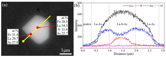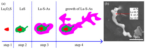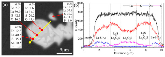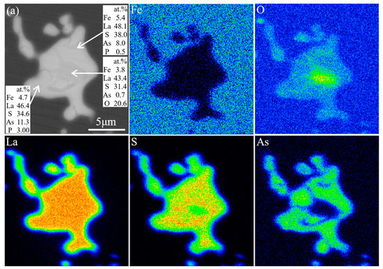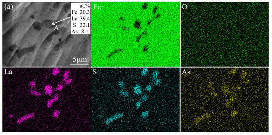 18]. It is noted that the arsenic compounds are not the first ones to generate in molten steel after RE additions; instead, the first ones are oxides, oxysulfides, and sulfides of RE [