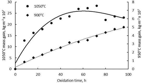 Cumulative mass gain rates of the specimens oxidized at 900 °C and 1050 °C.