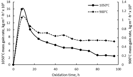 Although the mass gain of the oxidized specimens at 900 °C follows a parabolic law during the first 24 h, it appears to be more linear as a function of exposure time for the rest of the oxidation time. The oxidation process at 1050 °C follows a nearly-parabolic law. An increase of the mass gain was registered until the 10th exposure cycle followed by the specimens’ mass loss. Over the whole exposure period, the cumulative mass gain rate calculated for the specimens oxidized at the two temperatures as a function of time exhibits similar behavior, as shown in Figure 2. For both oxidation temperatures, the mass gain rate increases rapidly in the first 8 h of exposure time, after which the mass gain rate steadily diminishes.