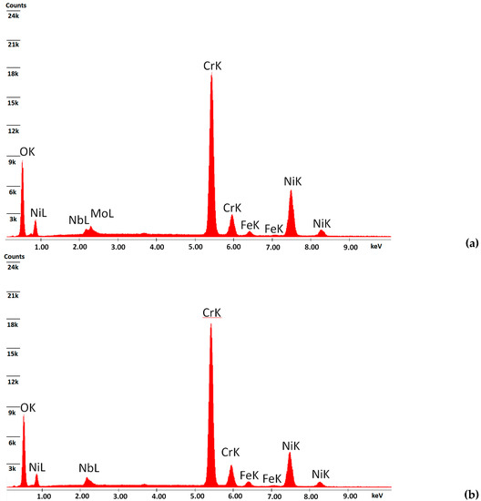 The EDS analysis performed in the four different microareas, in the oxide scale, and in the base material under the interface with the oxide layer, showed a higher Cr content at the oxide scale’s level compared with the base material. The chemical composition of the base material under the interface with the oxide layer showed a partial depletion in Cr due to the formation of chromium oxide, which was observed for both high-temperature oxidation processes, followed by different other oxides or spinels. The surface of the base material depletion in Cr caused by the outward diffusion was observed also in case of AMed IN 718 [33]. Besides a depletion of Cr near the interface, a high content of Nb and Mo was registered, which is consistent with the findings of Chyrkin et al. [31,41] who reported that Cr influences the Nb and Mo activity causing an uphill diffusion to the Cr-depleted zones towards the interface between the oxide and the alloy. This behavior was reported to be more pronounced in IN 625 thick specimens than in thin foils [41]. A high Nb content was highlighted in the oxide scale, caused by the standard free energy change of Nb oxidation reaction. Among the oxidation reactions which occur at a high temperature of all alloying elements of IN 625, the oxidation of Nb has the highest negative standard free energy, followed by Cr, Mo, and Ni [22].