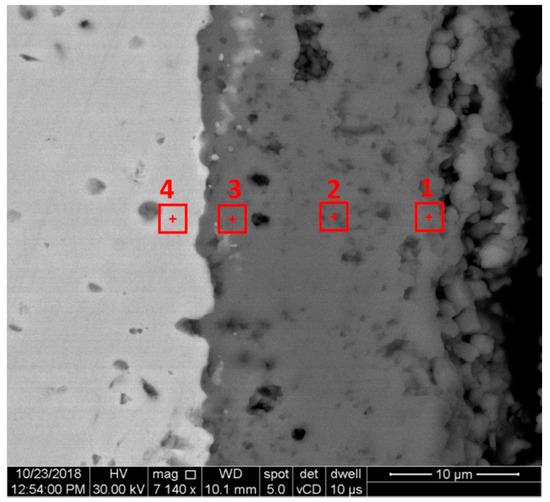 The EDS analysis performed in four microareas (three in the oxide scale and one in the base material under the interface with the oxide layer) in the specimen’s cross-section was realized in order to determine which chemical elements react with oxygen during its diffusion in the baseline material and whether a reduction in the overall metal at the specimen’s surface is registered. Table 2 and Table 3 present the result of the EDS analysis on four different microareas, as shown in Figure 4 for the specimen oxidized at 1050 °C, after 96 h of exposure, in an area where the oxide scale was unspalled.