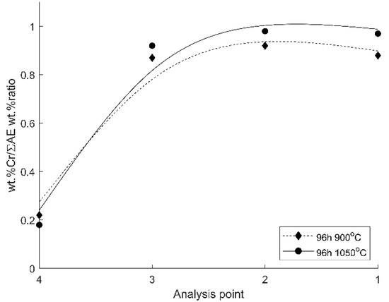 In the middle of the scale section (microarea 2) and the outer surface of the oxide scale (microarea 1), the specimens oxidized at 1050 °C exhibit a higher Cr/ƩAE ratio than those oxidized at 900 °C. For the specimens oxidized at 1050 °C, the Cr content in the total alloying elements represents 0.97–0.98 (Cr/ƩAE close to unity), as compared with the lower Cr/ƩAE ratio of 0.88–0.92 for the specimens oxidized at 900 °C.