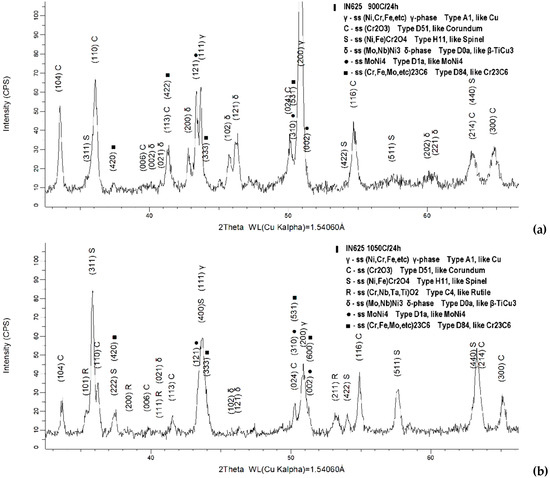 The phase evolution and oxide scale crystallographic nature were determined using XRD. Based on XRD results, it was concluded that the isothermal oxidation at 900 °C and 1050 °C for small periods of time (24 h) lead to multiple phases development. Secondary phases such as δ phase ((Mo, Nb)Ni3), an Ni-rich intermetallic (MoNi4), and complex carbides ((Cr, Fe, Mo, etc.)23C6) were identified, with results consistent with the findings of other authors [29,30,40,42]. Longer exposure time at 900 °C resulted only in the dissolution of complex carbides, the γ-FCC and δ phases being still present along with MoNi4 intermetallic, while the exposure at the higher temperature for longer periods produced the dissolution of δ phase, MoNi4 intermetallic, and carbides.