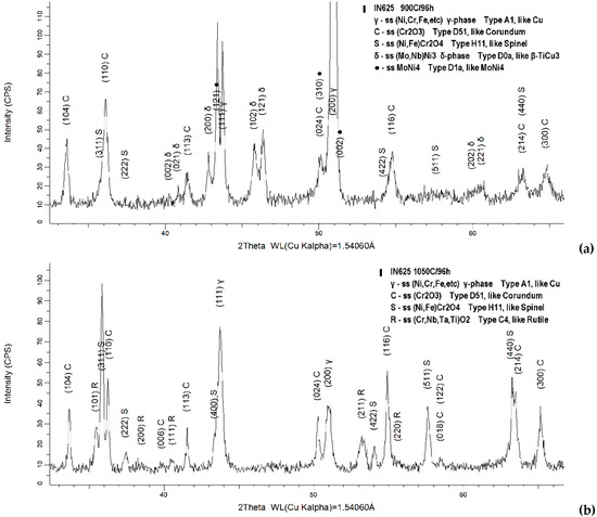 After prolonged temperature exposure (96 h), in the case of specimens exposed at 900 °C, the γ-FCC and δ phases were still present along with the MoNi4 intermetallic, but no more traces of carbides were identified, and the oxide scale consists in a form of Cr2O3. Compared with the lower temperature oxidation process, a different evolution was noticed in the case of the oxide scale formed at 1050 °C. The prolonged exposure at a higher temperature led to the dissolution of the δ phase, MoNi4 intermetallic, and carbides, with only the γ phase being identified. This can be attributed to the fact that the oxidation temperature is in the range of the solutioning heat treatment window of the IN 625 alloy, which has the very purpose of dissolving them. The oxide scale identified in this particular case consists in the (Ni, Fe)Cr2O4 spinel, Cr2O3 and rutile-like phase (((Cr+3(Nb, Ta)+5)(1−x)/2,(Ti+4)x)O−22).