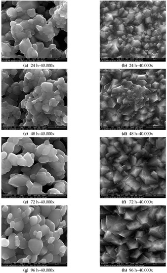 The morphological evolution over time of the oxide scales formed on specimens’ surface oxidized at 900 °C and 1050 °C, respectively, is presented in Figure 8. Comparing the SEM images, a different morphology of the developed oxide scales was noticed. The oxide scale formed at 900 °C presents an angular morphology compared with the rounder morphology observed in the case of the oxide scale formed at 1050 °C.
