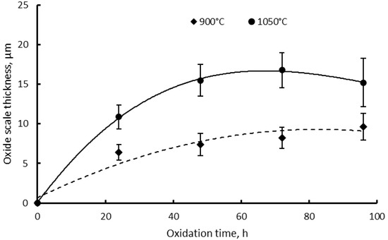 The evolution of oxide scale during the exposure time at the high temperature was assessed by thickness measurements on the specimen’s cross-section, as shown for the illustration in Figure 9. Figure 10 presents the oxide scale’s thickness evolution during the isothermal oxidation up to 96 h for both temperatures. The oxide scale thickness values are the average of 13 measurements done on 3 images for each exposure time. A parabolic evolution of the oxide scale thickness as a function of time was registered in both types of oxidation processes. A significant difference between the oxide scale’s thicknesses for the two temperatures was registered. The thickness of the oxide scale formed at 1050 °C is almost double when compared with the oxide scale formed at 900 °C. The oxide scale thickness increases fast during the first 24 h of exposure, then the increase is more moderate between 24–96 h at both temperatures. During the exposure between 24–96 h, the oxide scale thickness increases at 900 °C is lower than at 1050 °C.