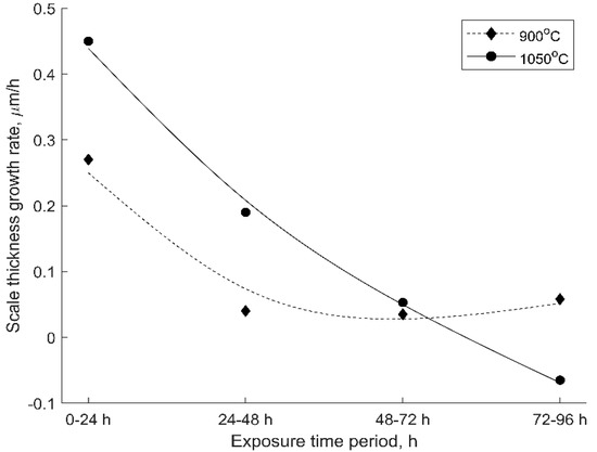 During the oxidation at 1050 °C, a significant steady decrease of the growth rate was registered after 24 h of exposure, reaching at 72 h a similar value as in case of the growth rate recorded at 900 °C oxidation.