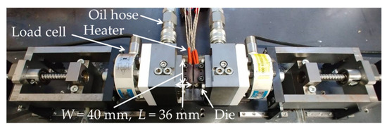 Figure 1 shows the appearance of the THF machine, and Figure 2 shows a schematic of the THF system used for the experiment in this study. The machine consisted of an oil pump, servo-motors, load cells, cartridge heaters (250 W) and a heater controller. The pump loaded the internal oil pressure, and the motors applied the axial feeding for both tube ends. The processing was carried out at 250 °C. The heaters could heat the tube to 250 °C in approximately 140 s. The heat resistance of the oil was 350 °C. During the heating, the machine was covered by a case made of aluminum, and the case was filled by Ar gas to avoid fire.