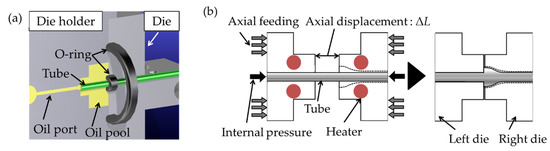 Figure 3a shows the oil sealing mechanism. The oil was sealed by two O-rings. The deformation of each tube end inside the oil pool was restrained by a restraining ring made of steel to avoid expansion of the tube in areas other than the die cavity. Figure 3b shows the loading mechanism of the axial feeding and the internal pressure. The axial feeding was carried out by closing the die, in which process the distance between the left and the right die was changed. Therefore, the optional axial feeding amount was set as the distance between the left and the right die. These mechanisms could resolve problems, such as the preparation of a high-precision axial compressive punch and oil-sealing part, which were required in using THF with small tubes.